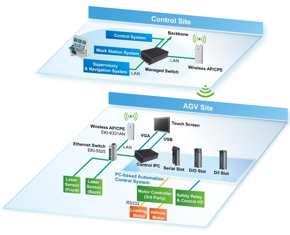 EITECH组合出了一套可提供数字输入输出、串行通讯、工业级无线网络、触控式人机界面这四大功能的解决方案。当监控室的管理系统透过无线网络发送坐标位置信息给无磁条式AGV时,车上的控制系统即能对电机、激光传感器、安全开关/灯号、车载电池等外围装置进行驱动与管控。而这套完善的解决方案中最主要的核心装置即是结合PLC与PC特性的控制器─EIX-210,它是一款能提供工业计算机高速运算性能并可整合各种I/O模块的PC-based开放式控制平台;其无风扇、低功耗、精巧紧凑、无线缆连接等特色特别适合AGV这种空间受限但稳定性要求极高的自动化控制应用;内嵌的工业级固态硬盘mSATA则具有绝佳的耐撞与防震效果可妥善保护系统与数据,同时也可在AGV整合时以既省时又省力的方式对AGV设备进行控制系统的大量复制。